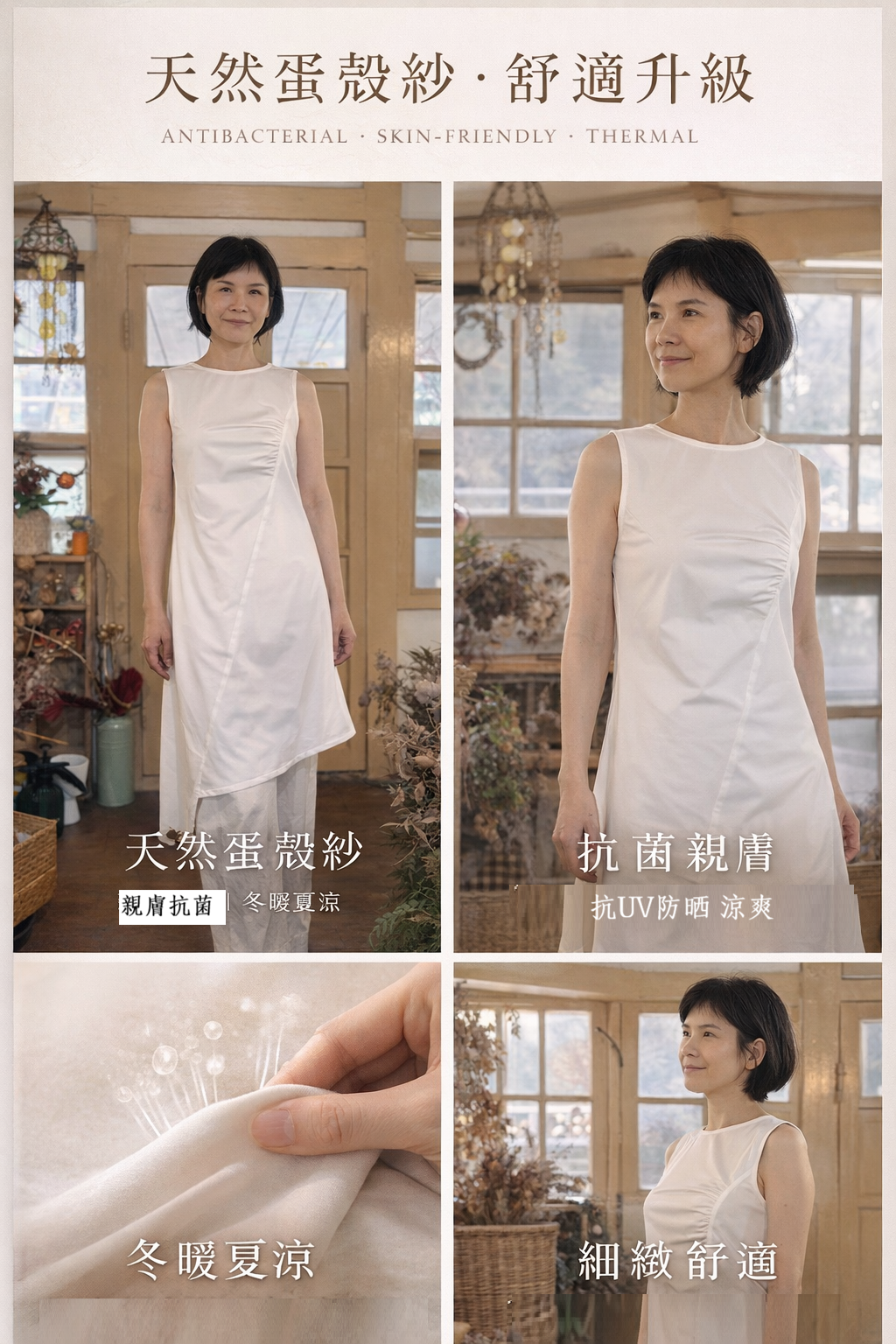 天然蛋殼紗面料 ・抗菌親膚機能 ・冬暖夏涼溫控特性 ・不對稱剪裁設計